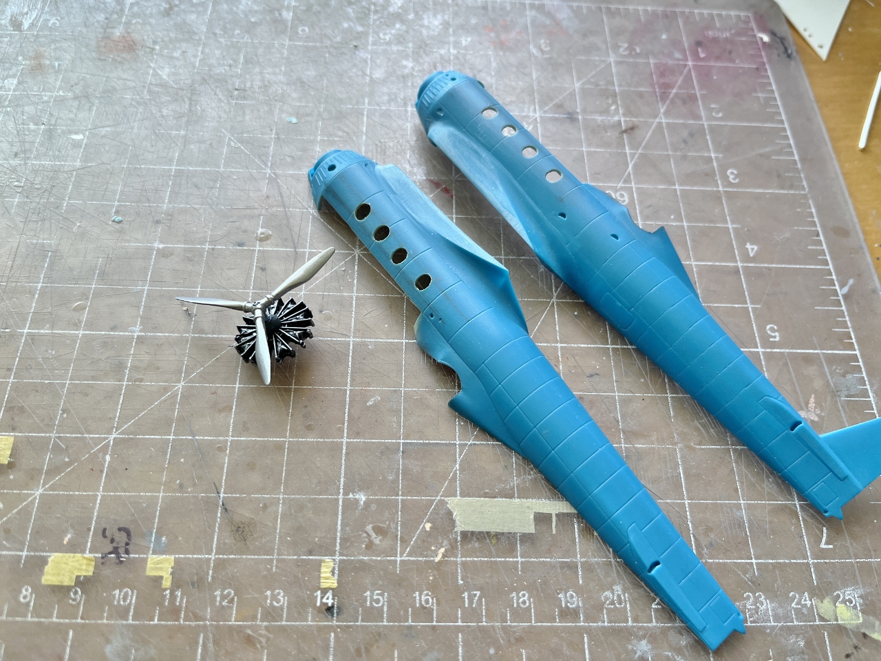 A "firewall" disc of styrene is glued to the nose, and then a ring made of a bent styrene stick glued to the it. The sum of both thicknesses resulting in the needed fuselage extension for the 221: